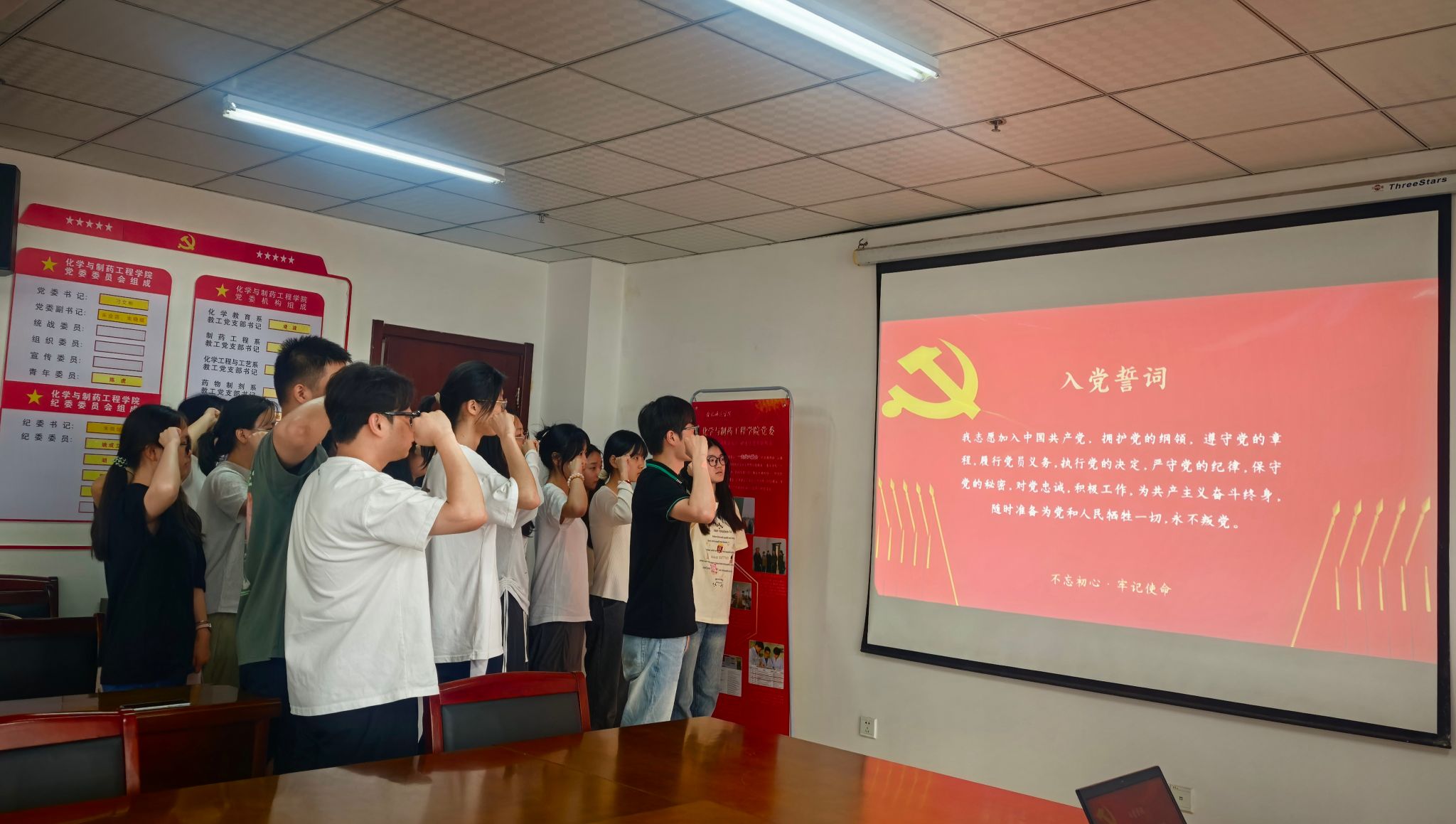 学生第三党支部书记徐王栋宣读了2025年上半年接收为预备党员的名单。在学生第二党支部书记潘云佳的带领下,全体新党员高举右拳,庄严宣读入党誓词。