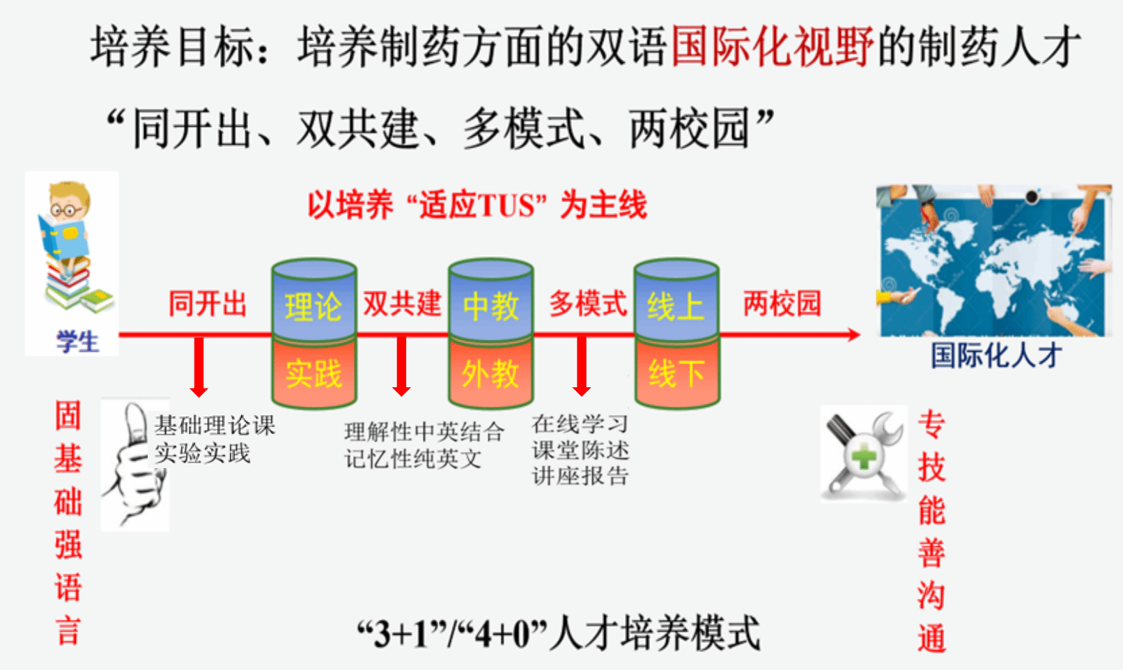 3.培养目标:本项目立足合肥、面向安徽、服务长三角地区(医药产业的升级、发展),通过合作办学,引进爱尔兰香农理工大学先进的制药教育理念和人才培养模式,培养德智体美劳全面发展,具有国际视野、创新能力、高度社会责任感、扎实的英语应用能力、解决实际制药工程问题的能力,适应制药及相关企业生产、技术开发、工艺与工程设计及安全用药服务等工作的应用型人才。学生具有化学、药学、工程学等相关学科储备,具备分析、解决复杂制药工程问题的能力和创新创业意识,具有沟通协作、终身学习的能力和全球化视野,具有强烈的爱国情怀和良好的从业道德,能够在制药及相关领域从事生产、技术开发、工艺路线与工程设计、质量控制与部门管理、科研等工作的高水平高素质应用型人才。