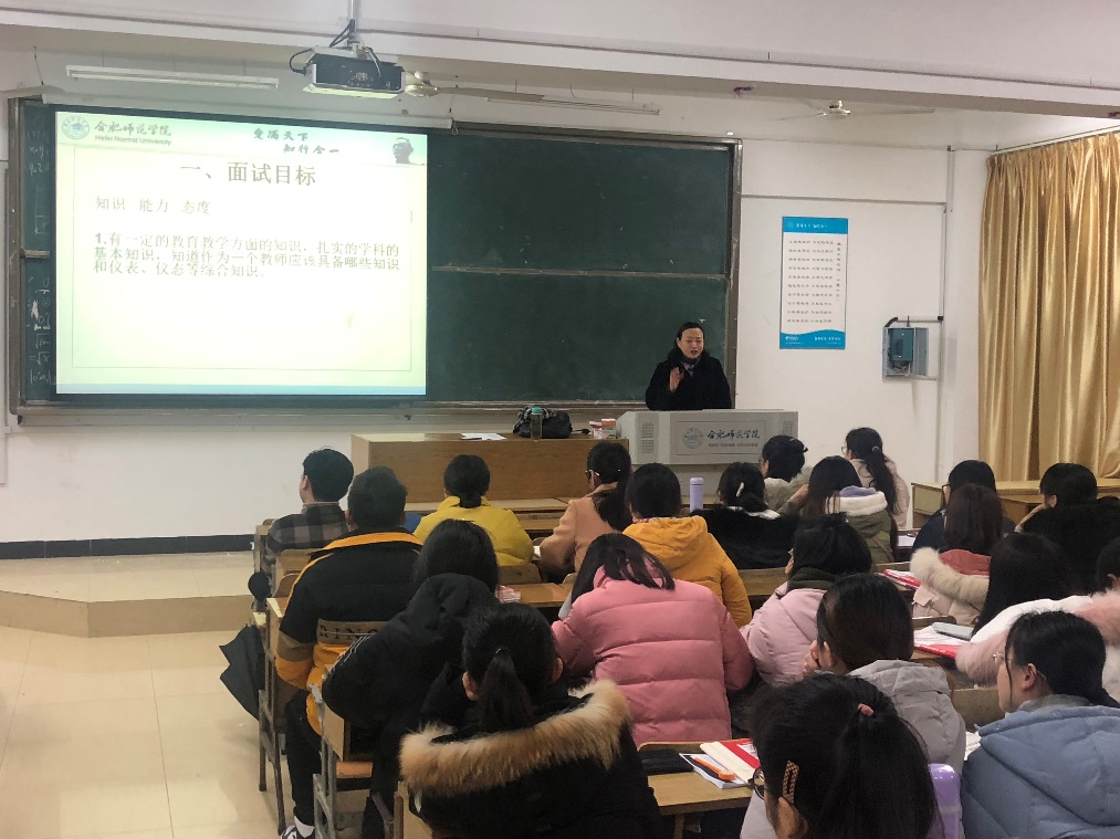 合肥65中学副校长、化学特级教师江乐宵老师为2016级化学(师范)班进行《中学化学教师资格考试标准与教师招聘专题解读》的课程讲授。江老师是合肥市教师招聘考试和教师资格证考试的面试考官,拥有非常丰富的面试经验。在授课过程中邀请了中学一线年轻教师与同学们进行同课异构教学,同学们受益匪浅。