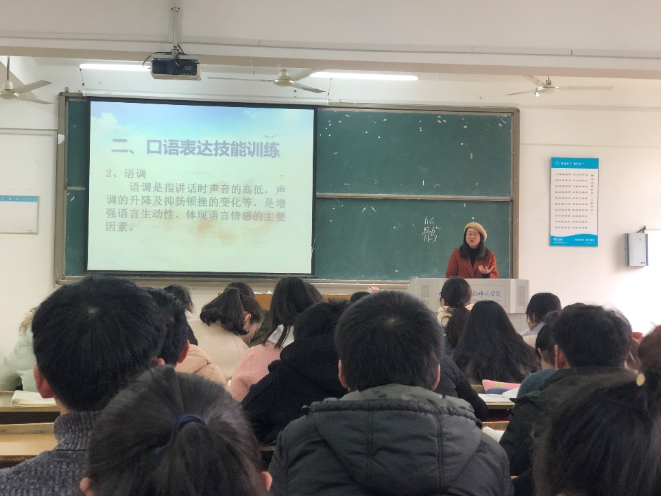tyc41183太阳成集团附属小学语文高级教师郑收老师为2017级化学(师范)班讲授《教师口语与教师礼仪》,郑老师多次参加国家级、省级以上教学比赛并获奖,对教师口语与教师礼仪课程理解深刻,讲授专业,上课生动,课堂气氛热烈,获得了很好的教学效果。