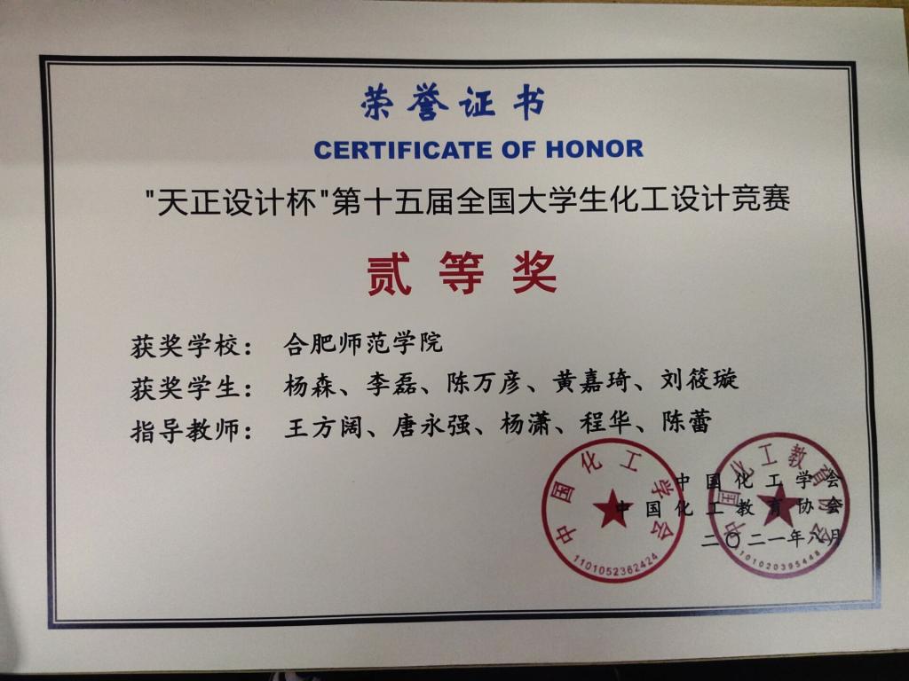 本网讯 近日,由中国化工学会和中国化工教育协会主办的“天正设计杯”第十五届全国大学生化工设计竞赛公布了获奖结果,学院学子喜获佳绩:“醇香悠长”团队(成员:杨森、李磊、陈万彦、黄嘉琦、刘筱璇,指导教师:王方阔、唐永强、杨潇、程华、陈蕾)获得全国二等奖,“one shot”团队(成员:张治国、刘哲、邹子涵、齐肖雨、王佳,指导教师:袁新松、张琪、康烨、李亮)获得华中赛区二等奖。