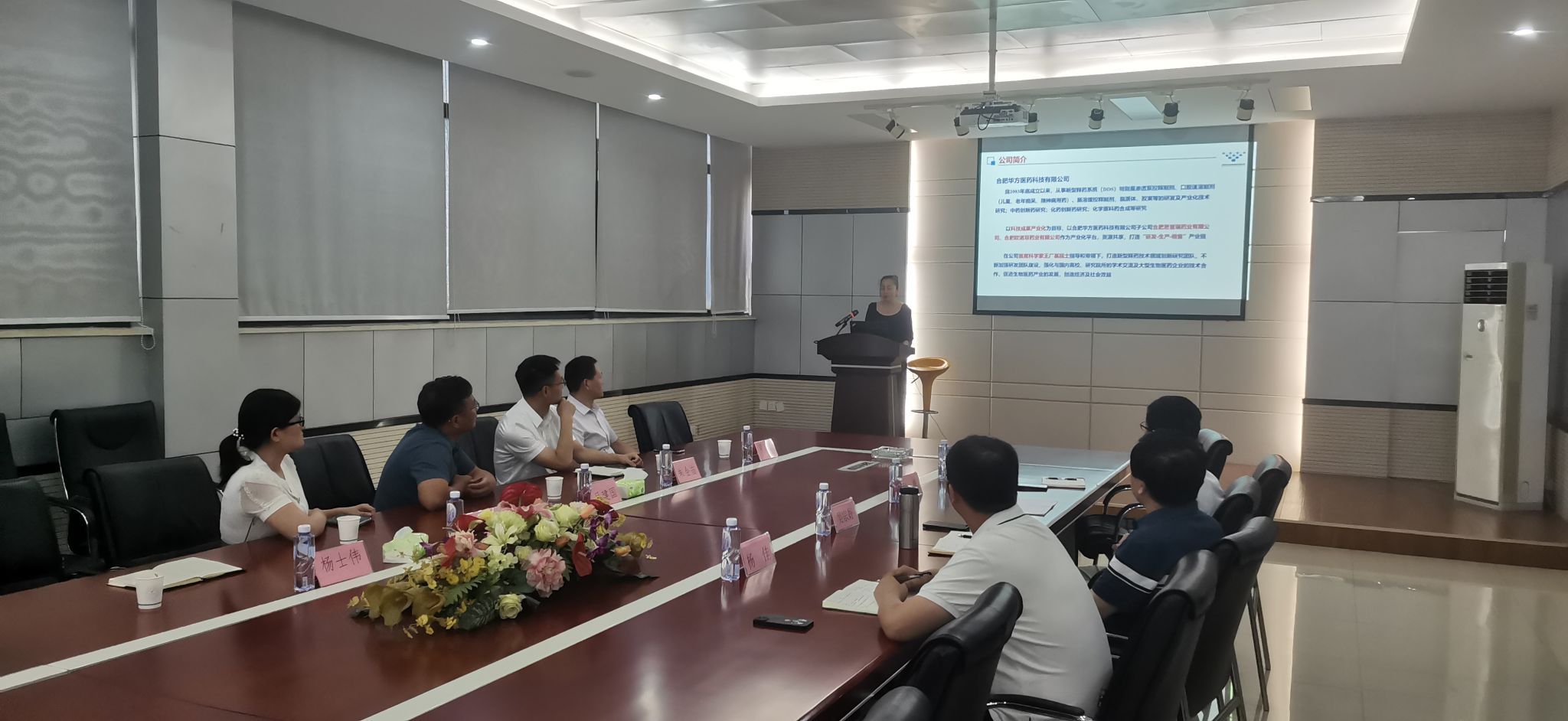 会上,吴宗好董事长代表合肥华方医药对我校一行的到来表示热烈欢迎,他首先介绍了公司的发展历史、主营业务、核心产品和公司规模等基本情况,行政总监戴红介绍了公司科研平台和荣誉资质等,副总经理何勇介绍了近年来企业与高校合作的基本情况、产品结构、核心技术和科技奖申报等。