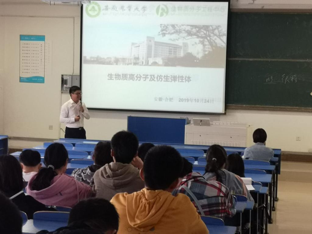 10月24日,安徽农业大学博士生导师、生物质分子工程中心主任汪钟凯教授,合肥工业大学博士生导师张洪斌教授受邀我校分别作题为《生物质高分子及仿生弹性体》《酶工程——绿色制药之源》的学术报告。讲座在锦绣校区逸夫楼A304教室举行,讲座由化学与化学工程学院制药工程系主任郑斌主持,制药工程专业教师、学生一同聆听学习。