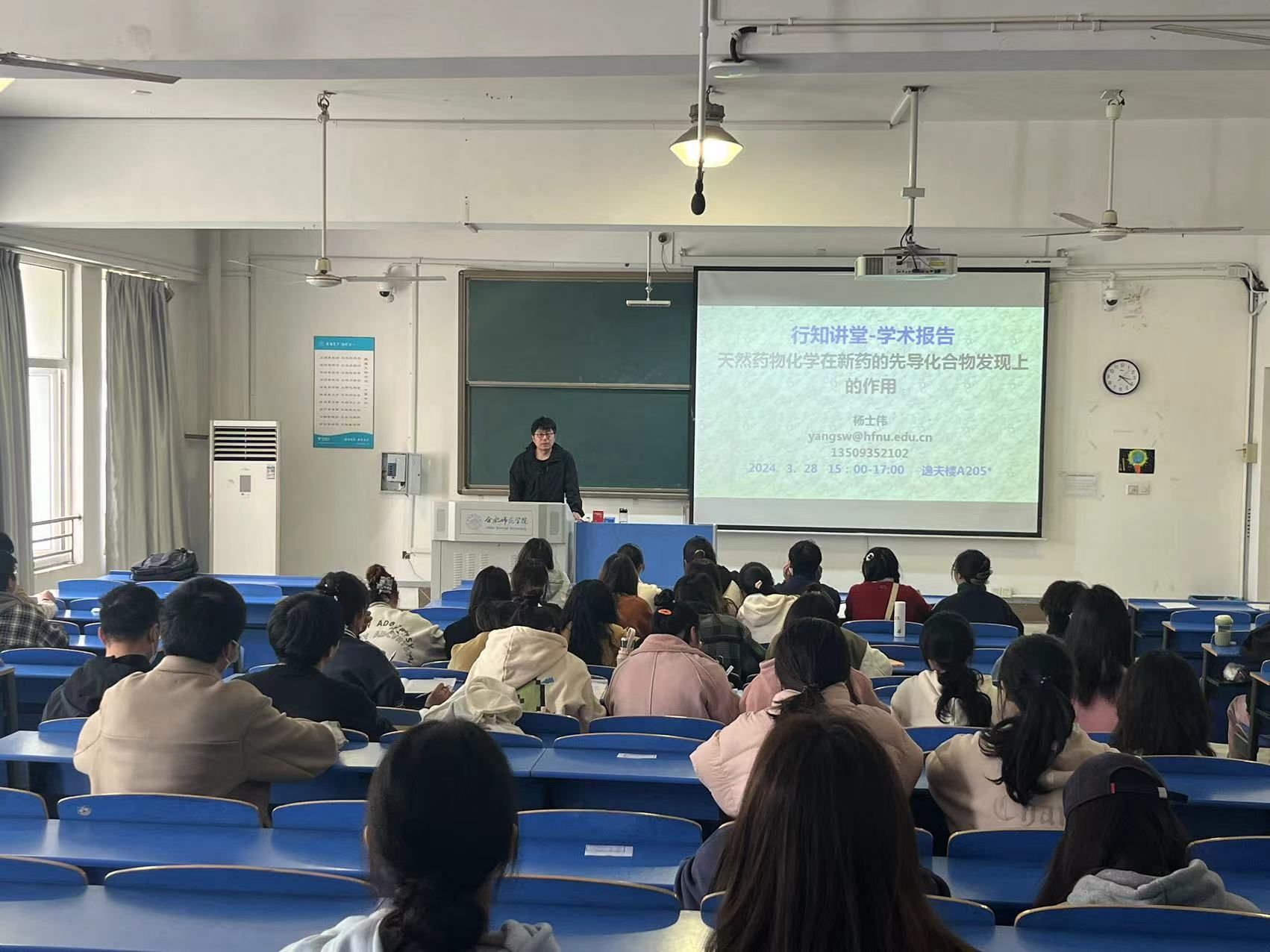 3月28日下午,太阳成集团tyc41183杨士伟老师在锦绣校区逸夫楼A205教室做了题为“天然药物化学在新药的先导化合物发现上的作用”的学术报告,20级制药工程,22级制药工程,23级制药工程等专业的100多名学生参加了报告会。