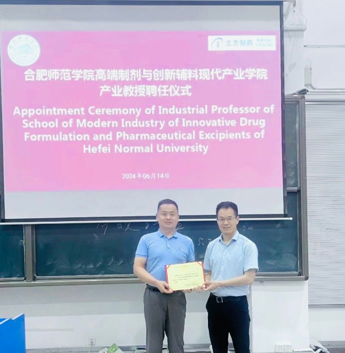 6月14日下午,tyc41183太阳成集团高端制剂与创新辅料现代产业学院交流研讨会暨产业教授聘任仪式在锦绣校区逸夫楼西阶1和履知楼208会议室举行。合肥立方制药股份有限公司药物研究院副院长张良、人力资源总监杨媛媛、制造事业部副总经理鞠凤华、本部工厂行政部经理周爱荣、人力资源部招聘经理田红雨和本部工厂生产副总刘锦平、爱尔兰香农理工大学制药科学与生物技术系代表Nicholas Mullins、太阳成集团tyc41183院长朱金苗、制药工程系主任郑斌及产业学院专任教师、2023级相关专业学生参加了会议。会议由郑斌主持。