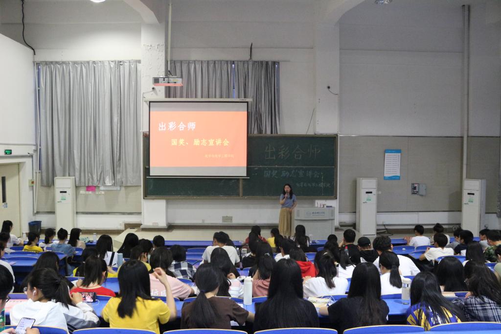 本网讯 为加强本院学生学风建设,按照学校“出彩合师”专题宣讲活动要求,化学与化学工程学院于5月22日晚19:00在逸夫楼西阶三召开“出彩合师”国奖、励志个人事迹宣讲会。化学与化学工程学院辅导员老师原嘉清主持此次宣讲会。