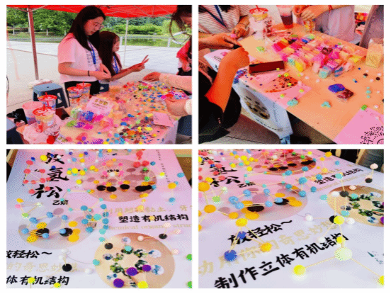 放‘氢’松活动属于艺术表达类,要求参与者使用超轻粘土和牙签制作含有氢键的有机物结构,现场工作人员耐心为参与者提供教学、案例示范及咨询服务。该活动让参与者在手工制作过程中,具象化学的另一面,感受化学背后的诙谐幽默,从而获得轻松愉悦的心情,培养乐观向上的心态。