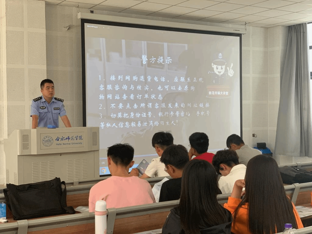入学教育期间,学院邀请了黄麓派出所陈警官给新生们开展了防诈骗讲座,生动的案例演示真实再现骗子的犯罪经过,进一步增强了新生们安全防骗意识。