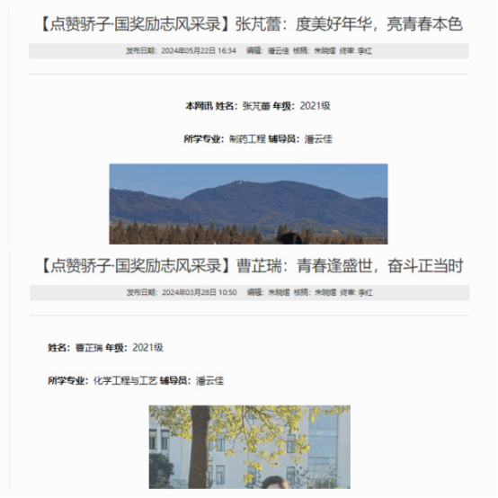 ——开展“出彩合师”优秀学生事迹宣传。学院在官方网站“学子风采”专栏设立【点赞骄子·国奖励志风采录】专题,积极宣传推广“出彩合师”国家奖学金和国家励志奖学金获得者个人事迹,充分发挥优秀学生榜样示范和价值引领作用,用身边人身边事教育引导广大学生。