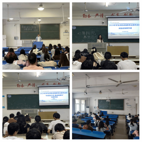——召开诚信主题班会。各班级以“树诚信之风,做诚信青年”为主题,召开主题班会19场,参与学生973人;通过诚信主题班会活动,向学生普及个人征信知识,引导学生重视个人征信;教育学生在申请贫困生认定、国家助学金等资助项目时,要恪守诚信,如实填报,不辜负国家信任培养。