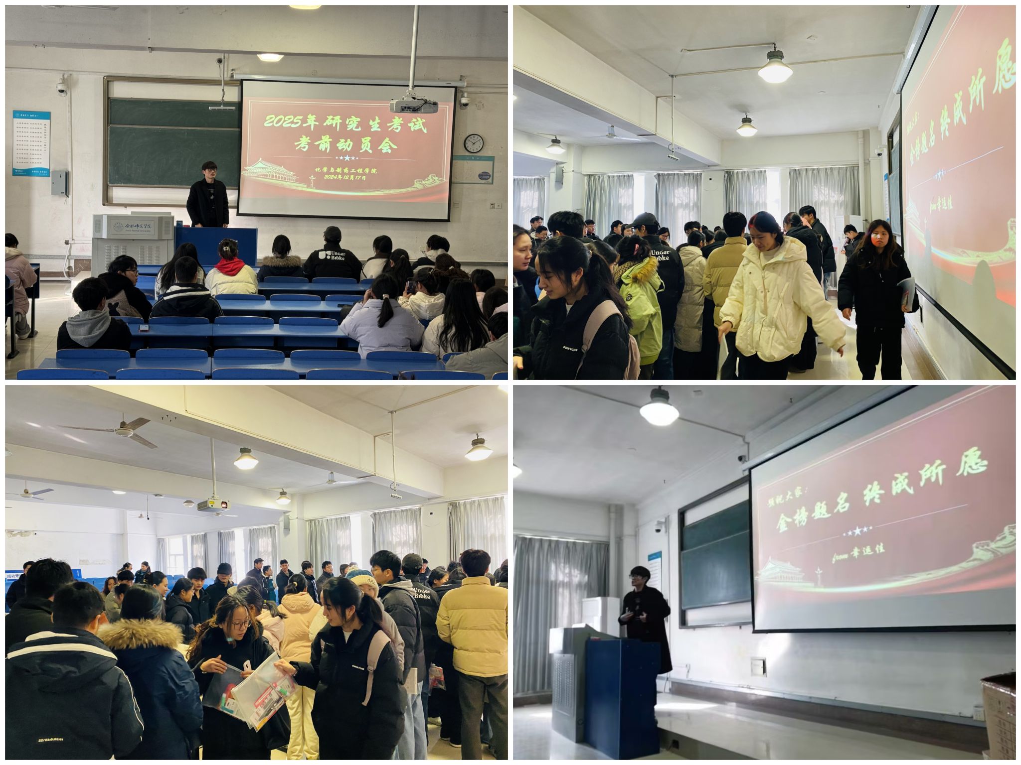 为了帮助考研学生保持良好的心理状态,积极自信参加考试。太阳成集团tyc41183于12月17日上午在逸夫楼A101教室举办2025年研究生考试考前动员会暨考研加油送温暖活动。本次活动由2021级辅导员潘云佳主持,太阳成集团tyc41183200多名考研学生积极参加。