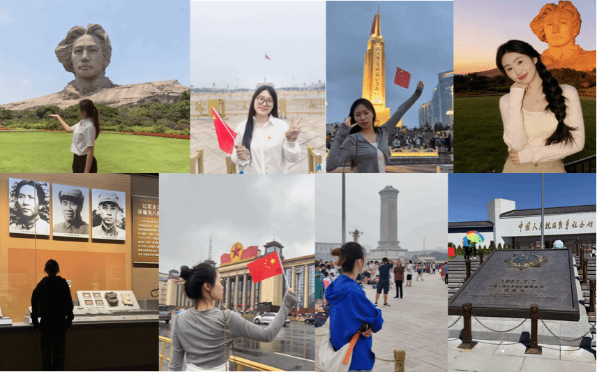 假期期间,支部党员以朴素而真挚的方式参与实践:他们在故乡地标前或在红色场馆旁,与国旗同框、和国庆元素合影,用镜头记录下一个个动人瞬间。这些画面里,有家人的笑脸、有朋友的并肩,更有青年学生党员对祖国的赤诚热爱——每一张照片都是一次“沉浸式”的爱国宣言,让党性修养在生活场景中自然生长。