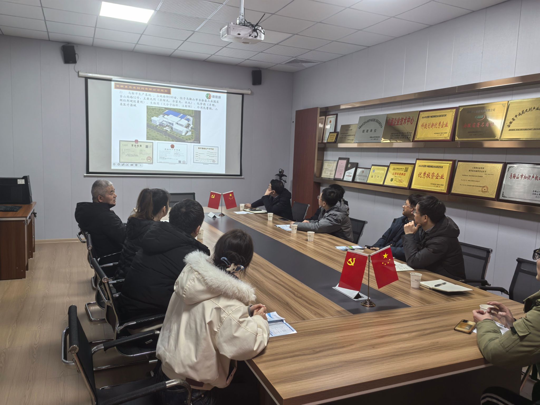 我校一行聚焦马鞍山市化工与医药产业发展,先后走访了几家行业重点企业。在安徽泰恩康制药有限公司,我校一行与公司管理层进行了座谈交流,就中药饮片与中药颗粒方向的合作项目申报安徽省科学技术进步奖等事宜进行了深入探讨。双方表示将围绕企业核心技术难题,联合申报省市级科研项目,进一步拓展合作深度。我校一行还看望了2名在该公司入职的学院2025届药物制剂专业毕业生,听取她们在企业的工作情况与发展感悟。